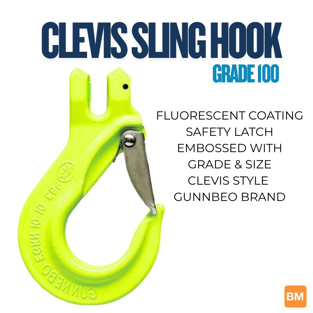 Grade 100 Clevis Sling Hooks come with a Safety Latch.