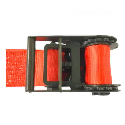 Orange 3" x 6' Underlift Tie Down Straps with short handle ratchet and protective sleeve