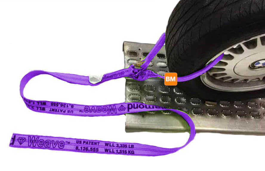 Easy to use wheel lift strap with a tapered thin loop to easily slide through the wheel!  Purple Diamond Weave tie-down