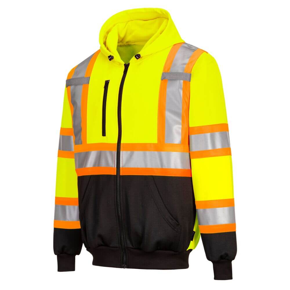 Versatile hoodie with a full zip, two-tone design, adjustable hood, and reflective X-back tape for visibility.